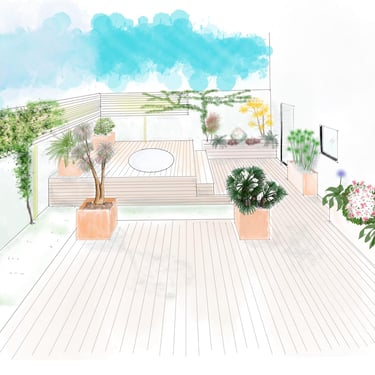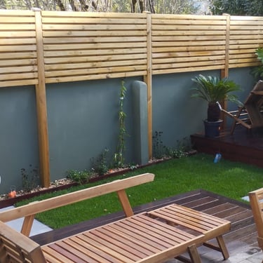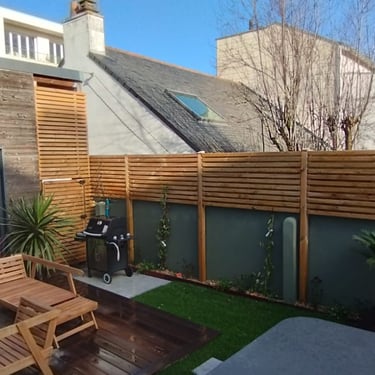 Les différents niveaux donnent du volume à l'ensemble et agrandissent ce petit espace! Le mur de couleur ajoute une touche claire et chaleureuse et permet à la palissade bois d'exprimer tout son potentiel! La remise autrefois ouverte a été fermée avec les mêmes panneaux.