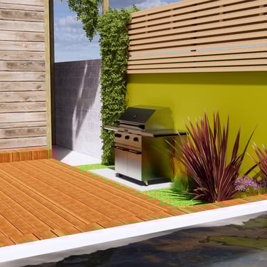Des éclairages, du gazon de placage, un espace en grès cérame pour le barbecue et des bacs viennent agrémenter l'ensemble.