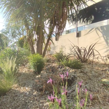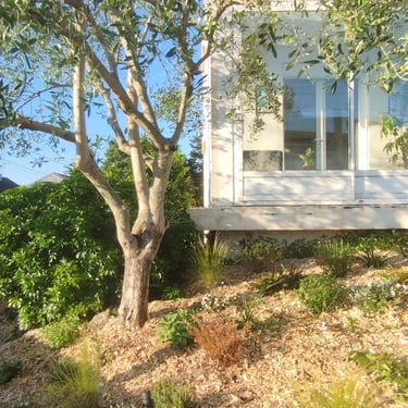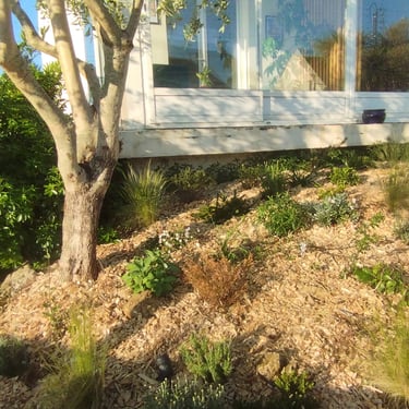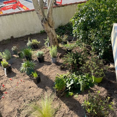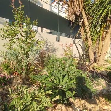 Nous avons crée un très grand massif fleuri, composé de vivaces et arbustes fleuris, tous adaptés à l'exposition sud. Un paillage permet de limiter l'évaporation et la prolifération des adventices les premières années, le temps que tout le monde s'installe et remplisse l'espace. Le devant de la maison n'est déjà plus le même avec ces nombreuses couleurs!