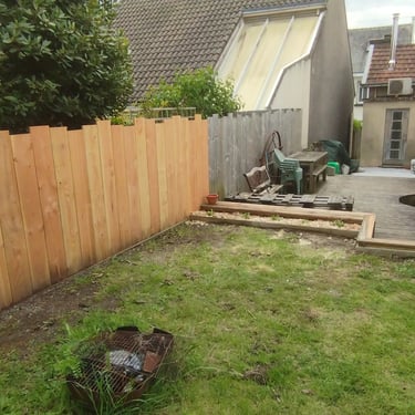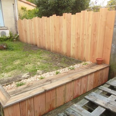 Etape suivante: on refait le gazon, une petite terrasse en Grès cérame et.... une palissade de l'autre côté!